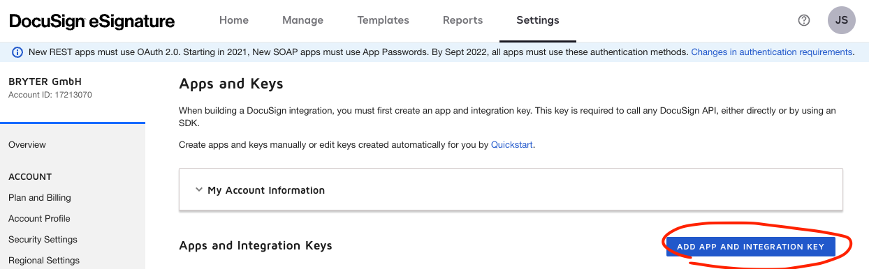 Log into your DocuSign developer account and open the Apps and Keys page.