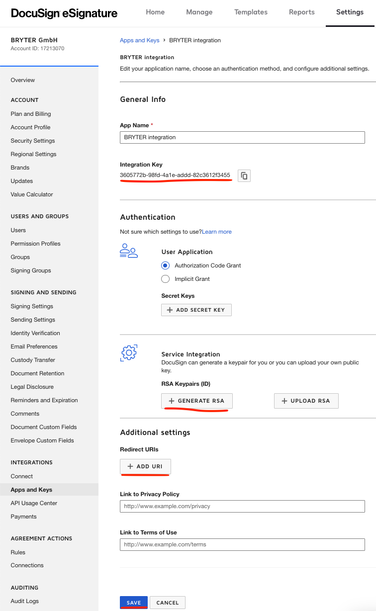 Now, you need to authorize your application to impersonate your developer account. Use this URL generator to generate your authorization URL. Select Demo environment, provide your previously saved Integration Key, and leave the default value for the Redirect URL (https://bryter.io).